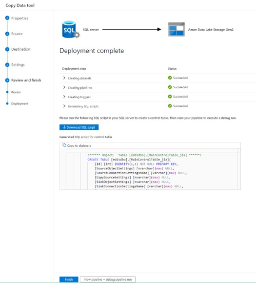 - If everything is configured correctly the pipeline will succeed. The time it takes to complete the pipeline depends on the amount of data and network bandwidth and other factors.